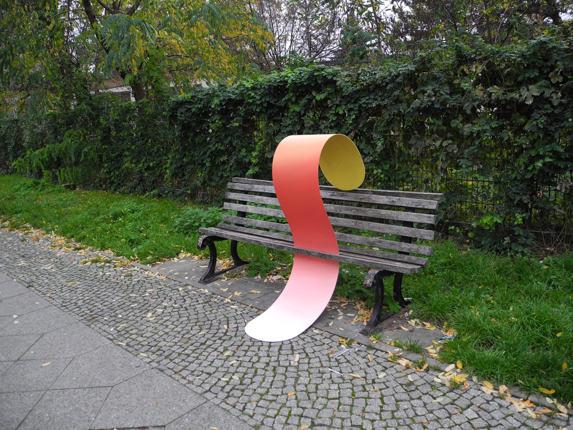 “Trudzinski's geometric forms rise brightly from a manhole cover, bend against a lowered roller shutter, stretch out on a bench, lean against a fence or arch between concrete pillars.”